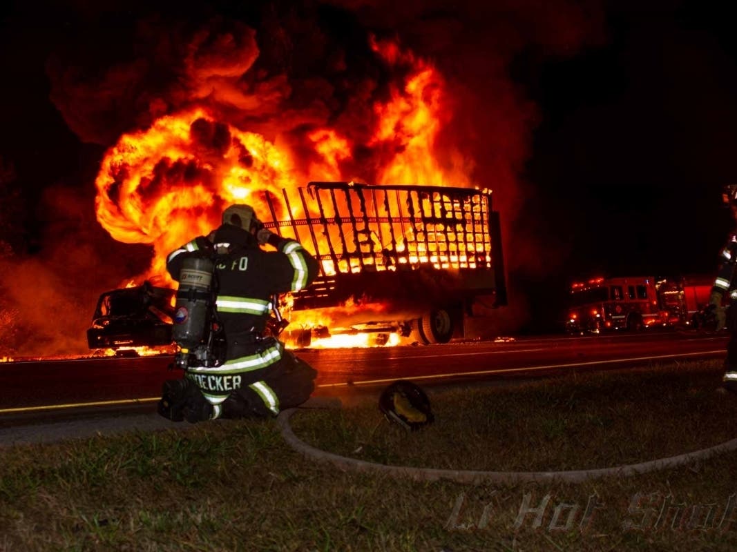 The truck, which was reportedly carrying linens, went up in flames, which caused the vehicle's diesel fuel tanks to rupture, spilling fuel onto the roadway and grassy shoulder, witnesses said.