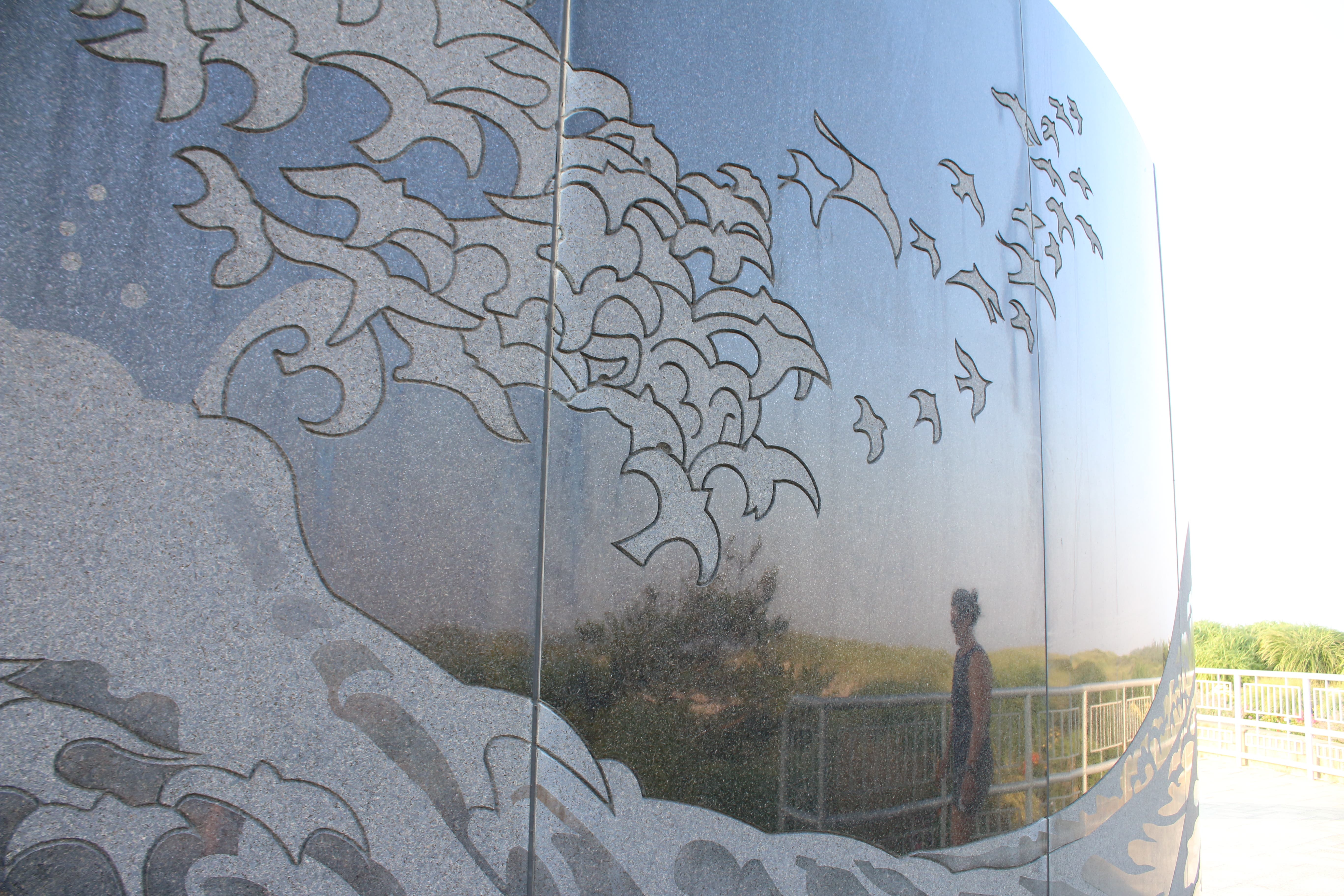 Inside there is a granite wall inscribed with the names of the victims on one side. Etched on the other side, there is a wave with birds ascending into the sky, but on Saturday, the same as every memorial, there were two memorial wreaths placed at the site — one for the passengers, the other for the crew members manning the flight.