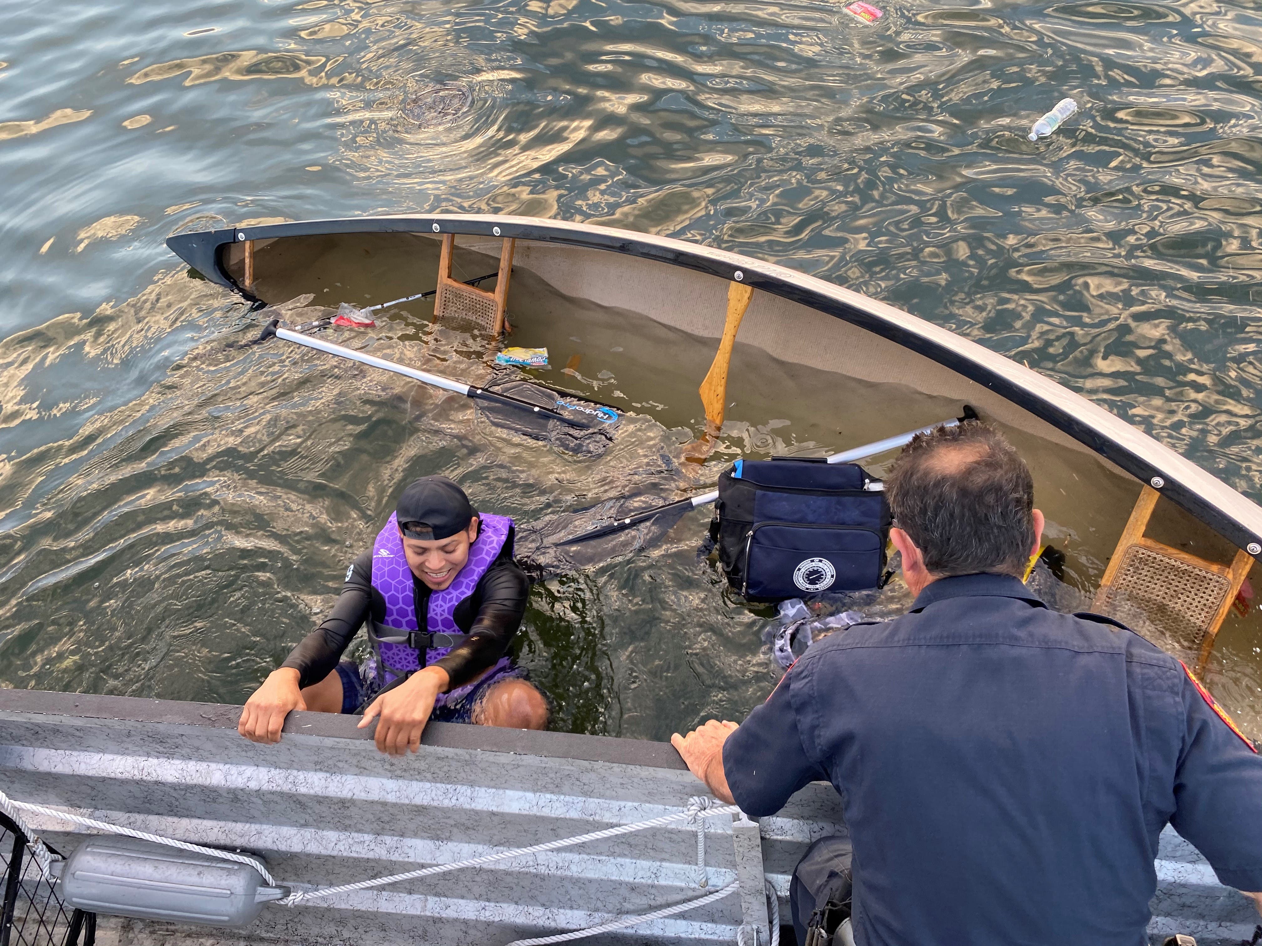 Flores and Bonilla were pulled aboard the air boat by Gifford and Aro, where they were quickly evaluated for injuries. The bay constables then removed the submerged canoe from the Long Island Sound.