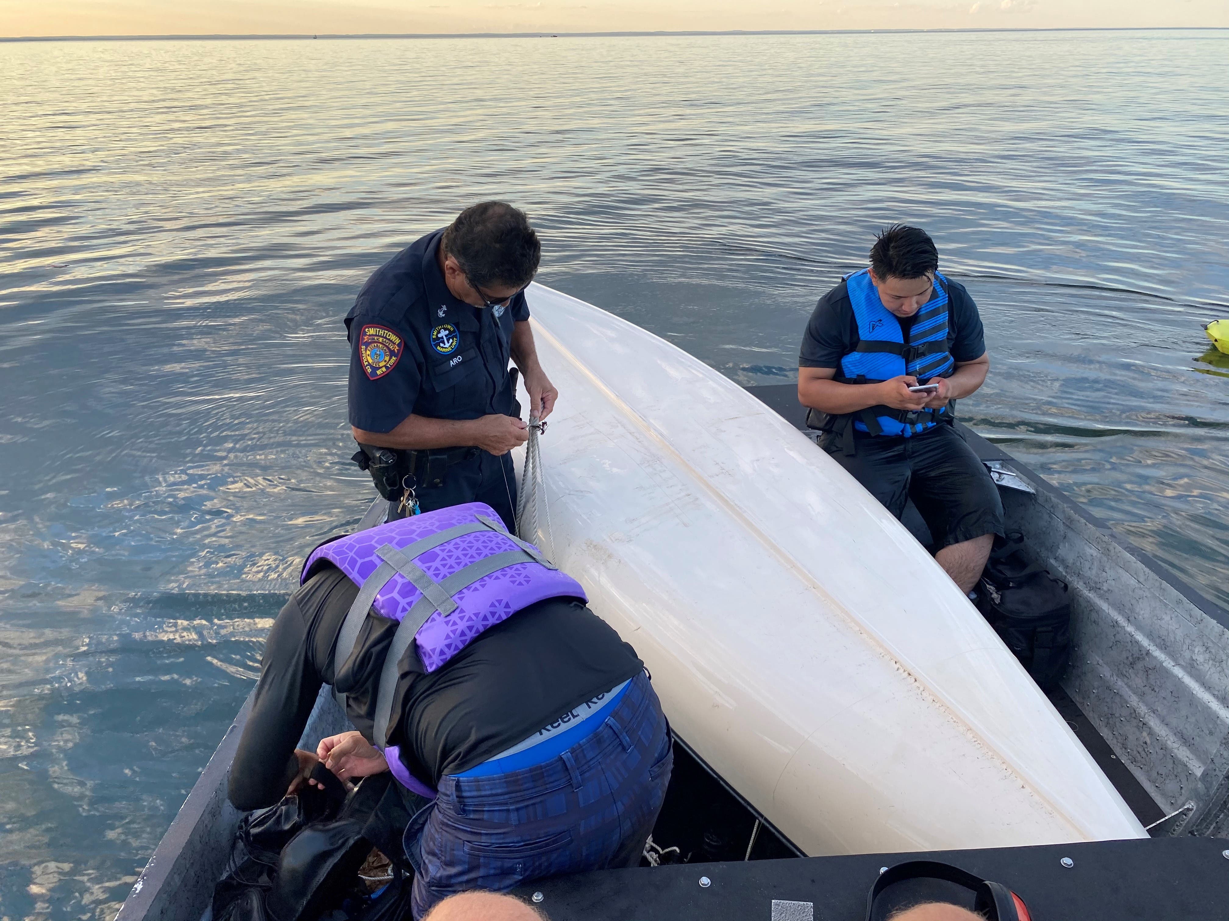 Smithtown Public Safety bay constables David Rosenberg, Blake Gifford and Carmine Aro were on patrol, exiting the mouth of the Nissequogue River, when Rosenberg noticed the two men floating. As they steered the air boat closer, the bay constables saw the fishermen waving and yelling for help next to their overturned canoe.