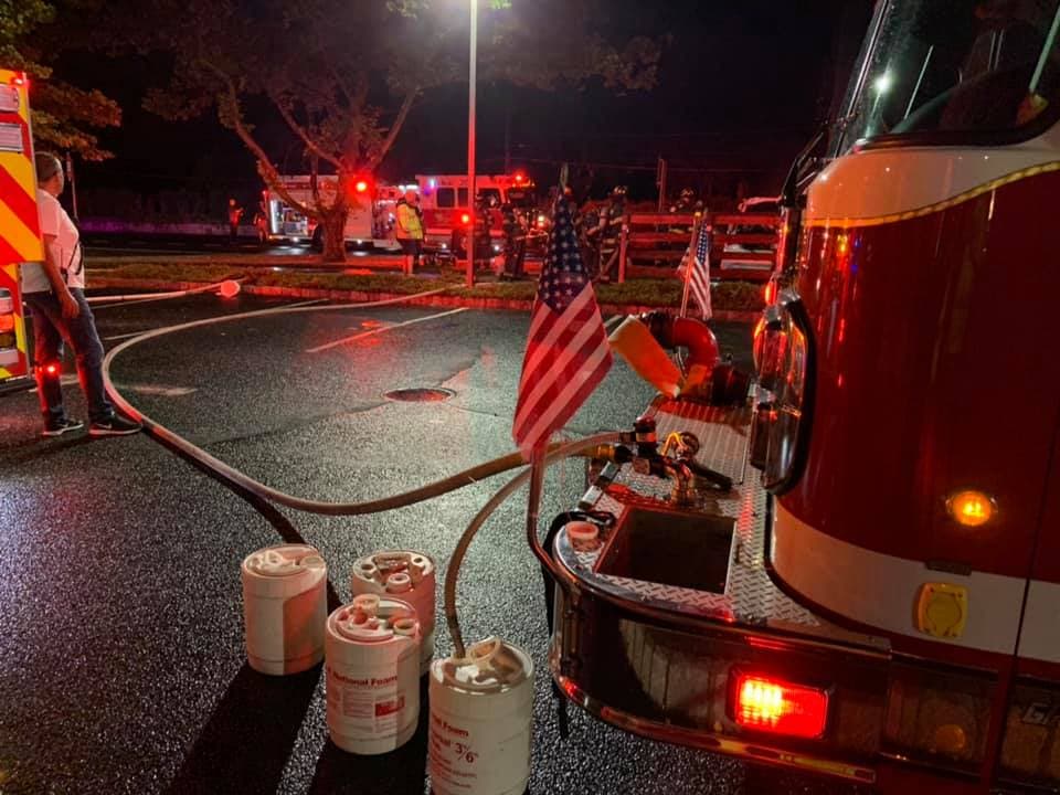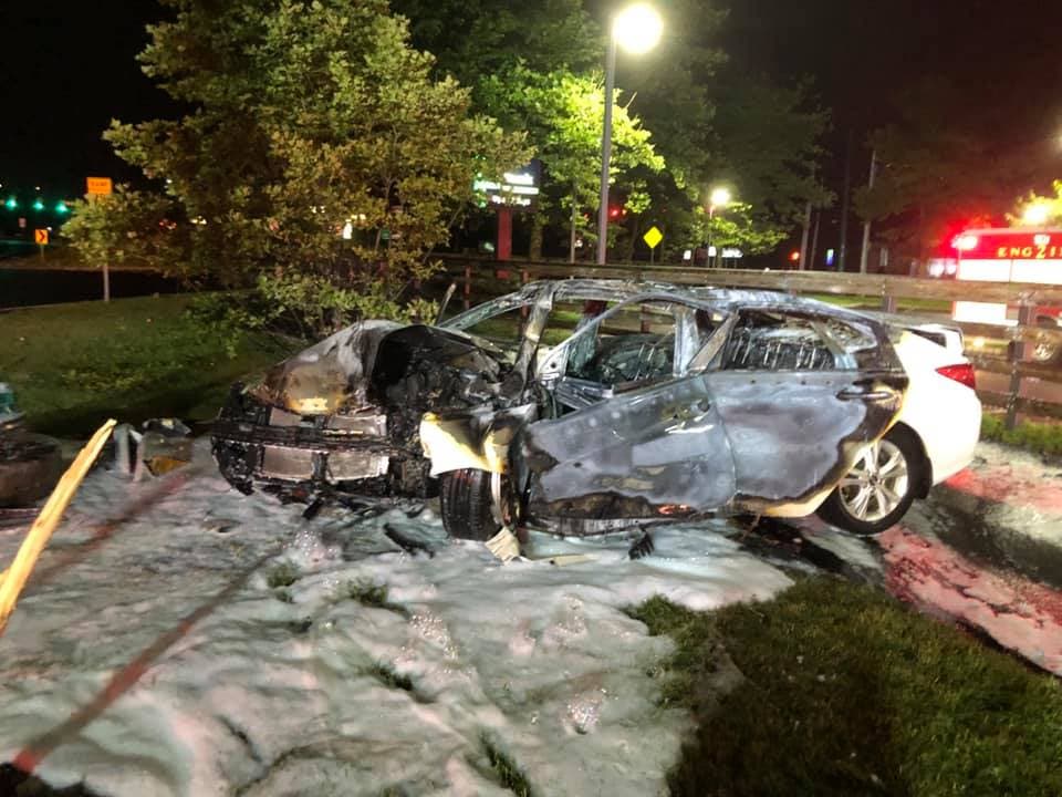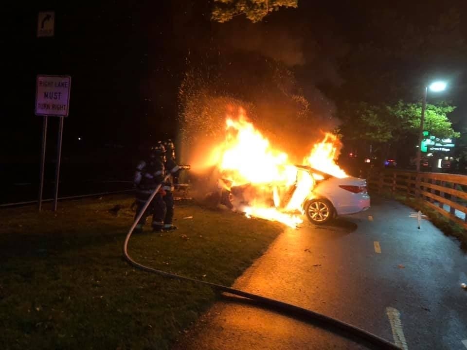 Firefighters responded to a call of a single car on fire after being involved in an crash in front of TD Bank at the intersection of 347 and 111 at about 12:40 a.m.