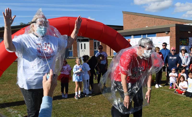 Because the fundraiser exceeded the $15,000 goal, Principal Ireen Westrack and teachers aide, Miss Lori, agreed to be "silly string" targets.