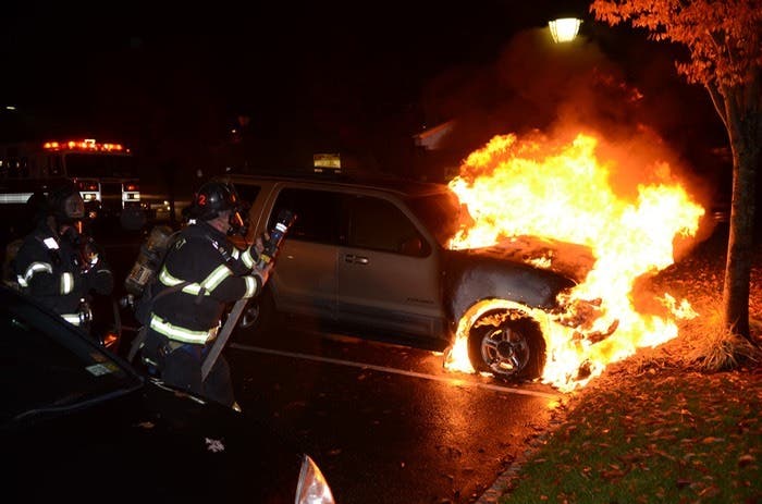 The Nesconset Fire Department responded to the fire in the parking lot of the Starbucks at the corner of Smithtown Boulevard and Nichols Road just after 9 p.m. Firefighters found the SUV burning and quickly extinguished the fire. No word on what caused the fire.