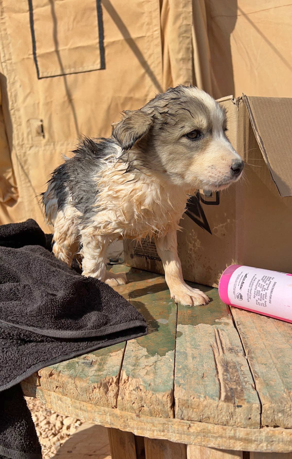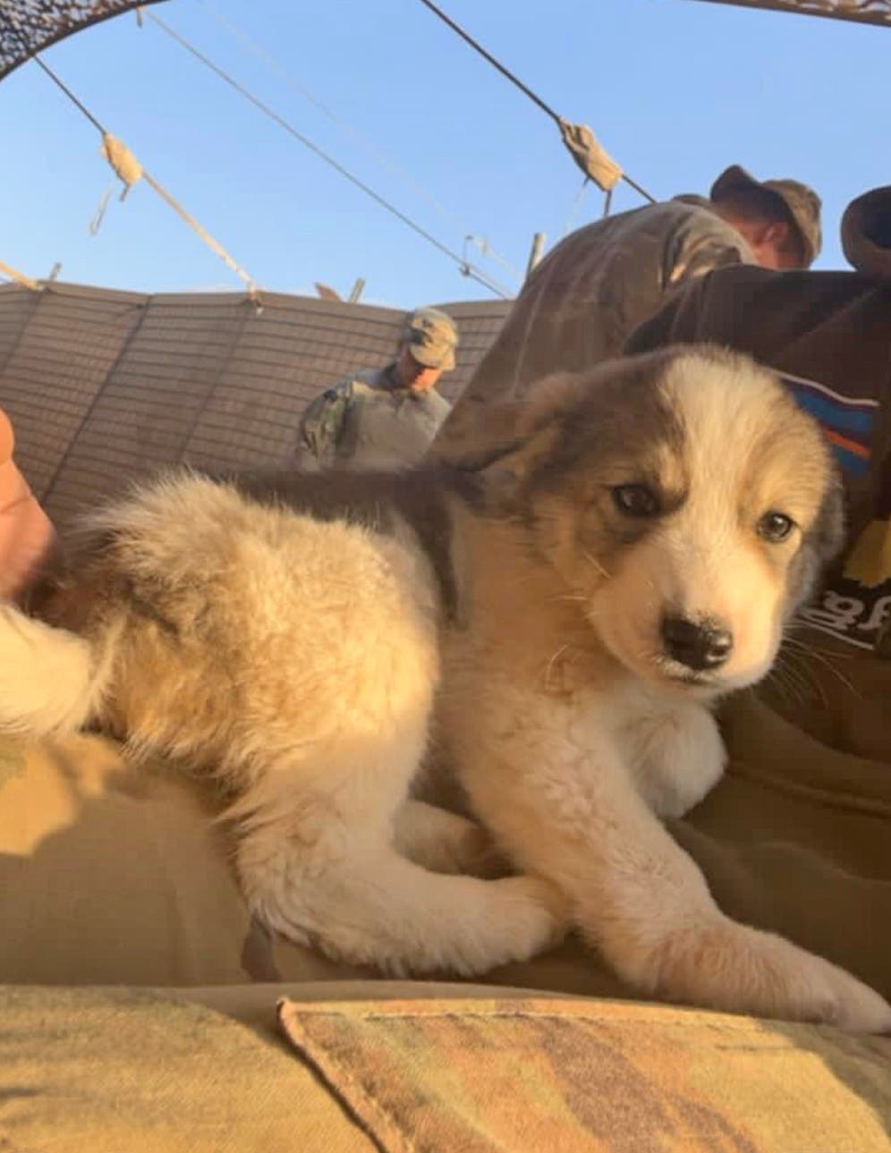 "This was heartbreaking to the sergeant, who is a dog lover, but he was helpless to do anything," the organization stated. "One of the locals saw the troubled look on his face and came over to him with a pup in an empty grain bag and told him that if he wanted, one could have it. Without hesitation, the sergeant grabbed the bag, not knowing what he would find inside."