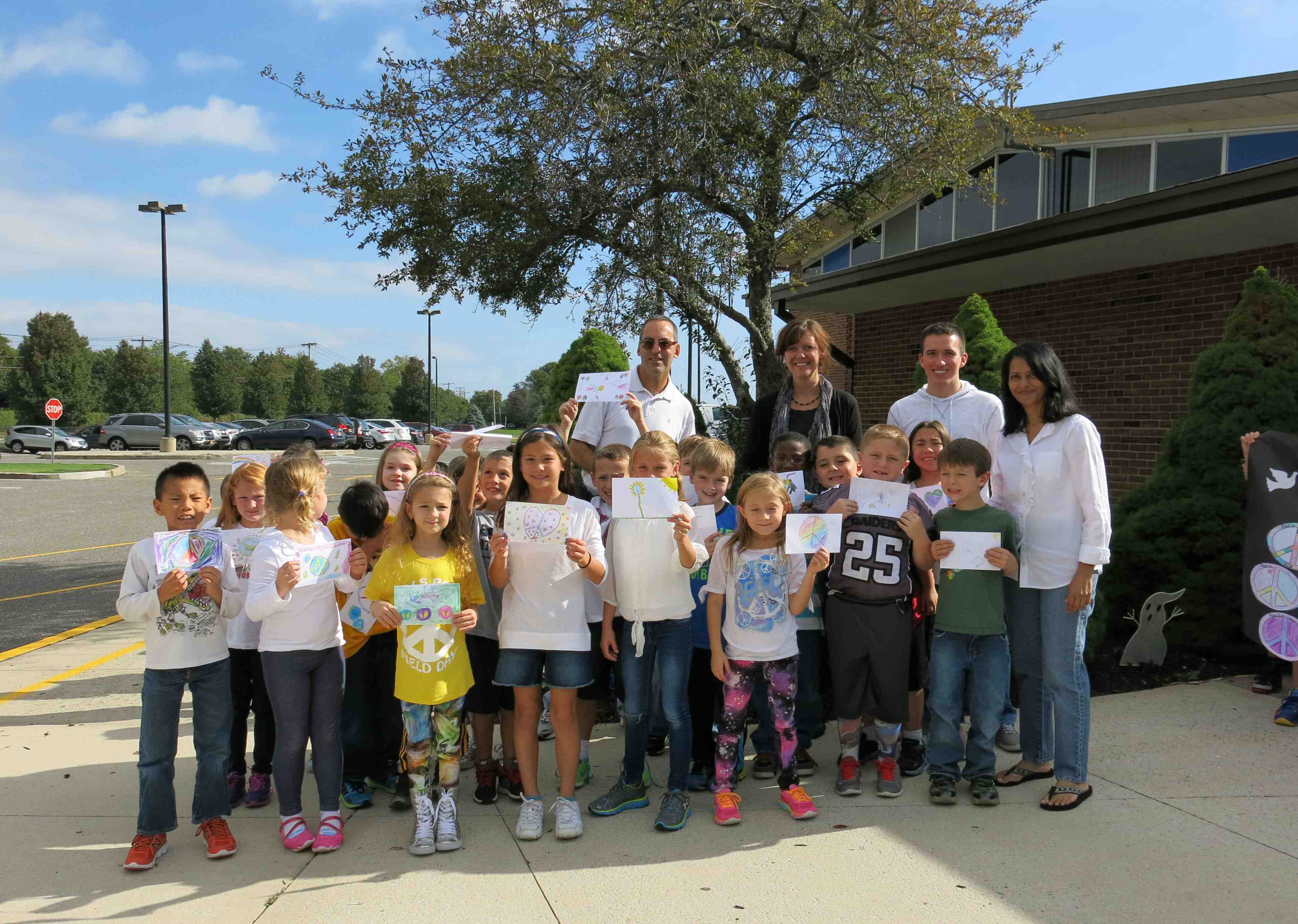 Photo courtesy of the Smithtown Central School District: Some Mills Pond ES students are pictured here with staff and administration displaying the postcards they will be sending to a school in India as part of the “Exchange Peace, One Postcard at a Time.”