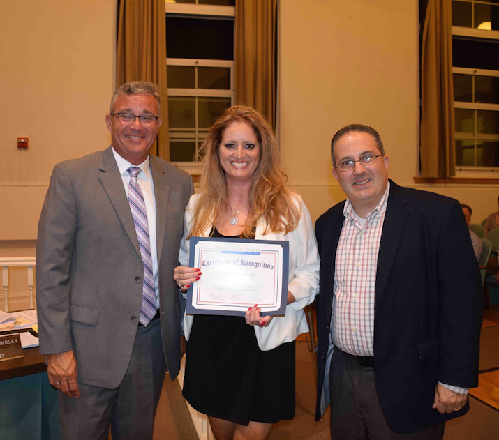Photo courtesy of the Smithtown Central School District: Smithtown Central School District honored physical education teacher Helen Flynn during a recent Board Meeting for earning the 2015 Secondary Physical Education Teacher of the Year Award. She is pictured here (center) with Superintendent of Schools Dr. James Grossane and Board of Education president Christopher Alcure.