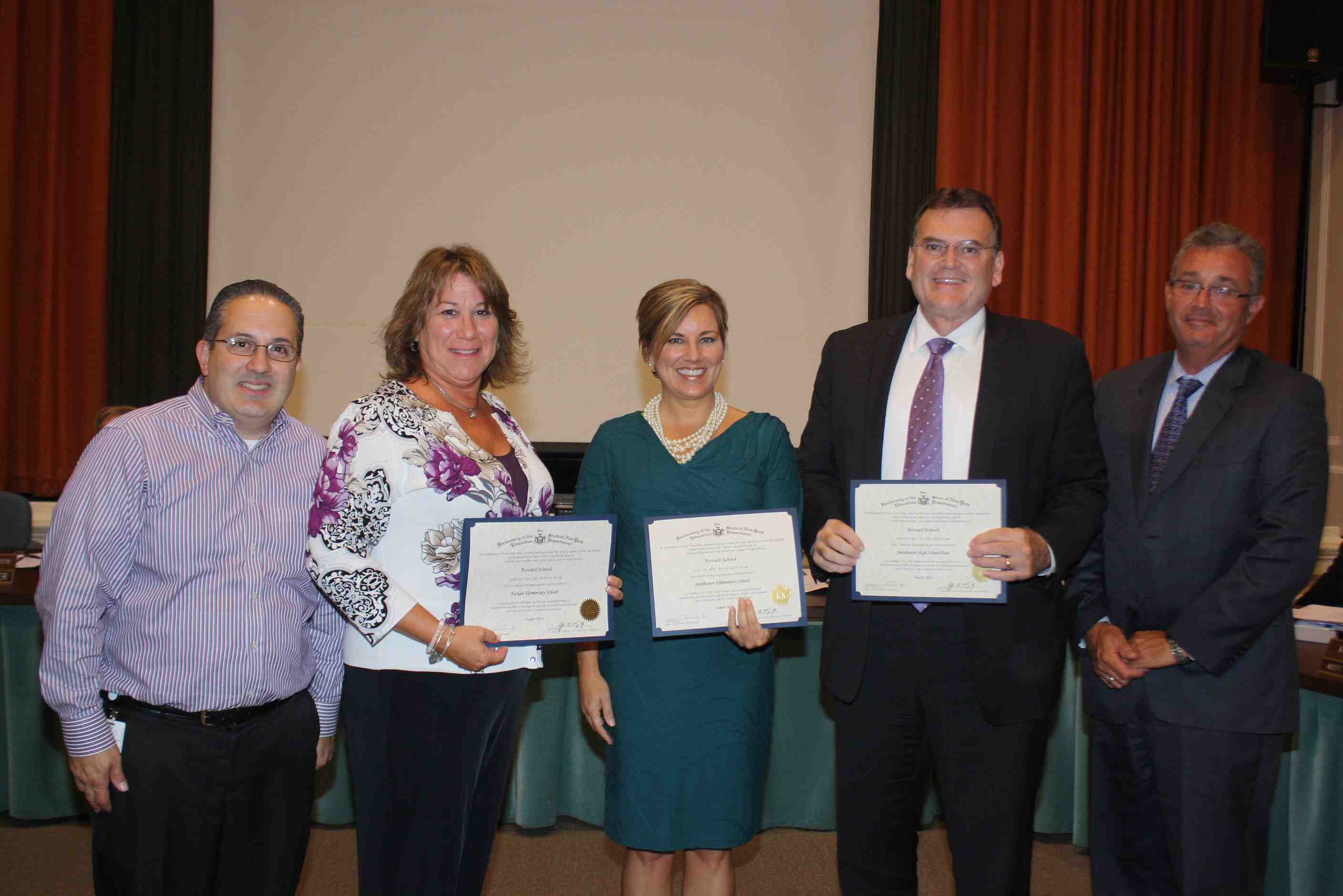 Photo courtesy of the Smithtown School District: Smithtown BOE President Christopher Alcure (far left) and Superintendent of Schools Dr. James Grossane (far right) present certificates of recognition to (l-r) Tackan ES Principal Allyn Leeds, Smithtown ES Principal Janine Lavery and HSE Principal Edwin Thompson for their respective schools’ Reward School distinction as high performing schools.