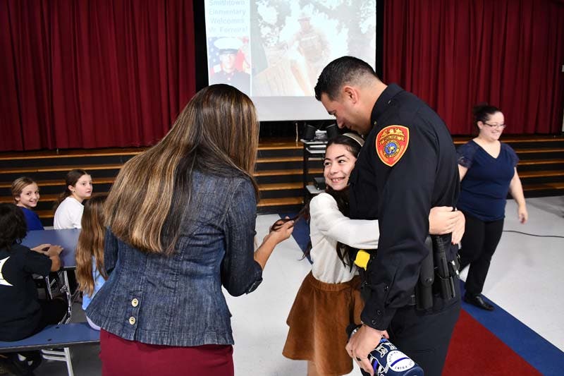 SMITHTOWN, NY — Matias Ferreira, a Marine Corps veteran and member of the Suffolk County Police Department, visited Smithtown Elementary on Thursday to talk to students about the importance of Veterans Day and being kind to students whose parents may be overseas, according to the school district.
