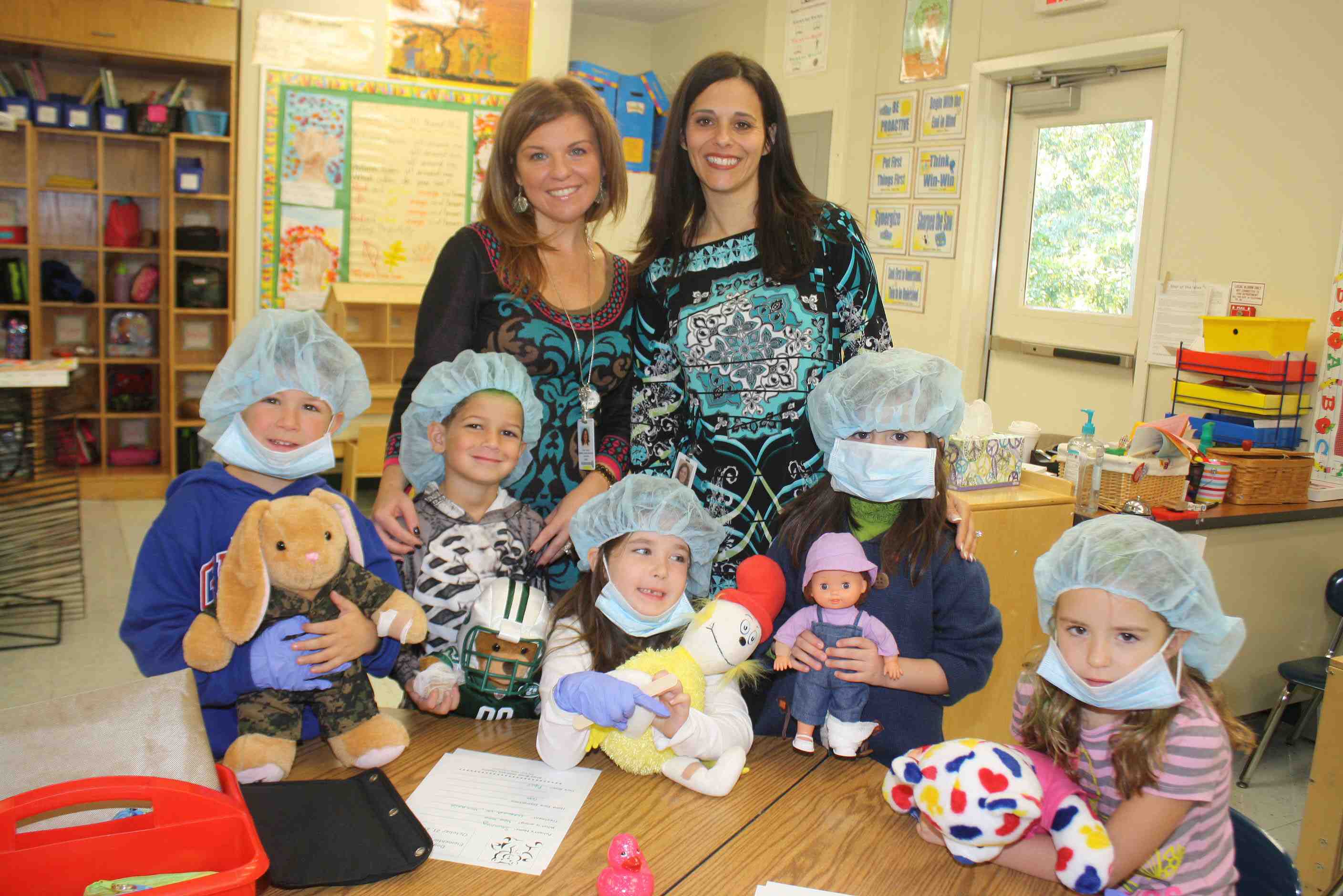 Photos courtesy of the Smithtown Central School District: Dogwood ES teacher Jillian Terlato (back left) with Principal Renee Carpenter, kindergarteners and their patients during the Dogwood teddy bear clinic.