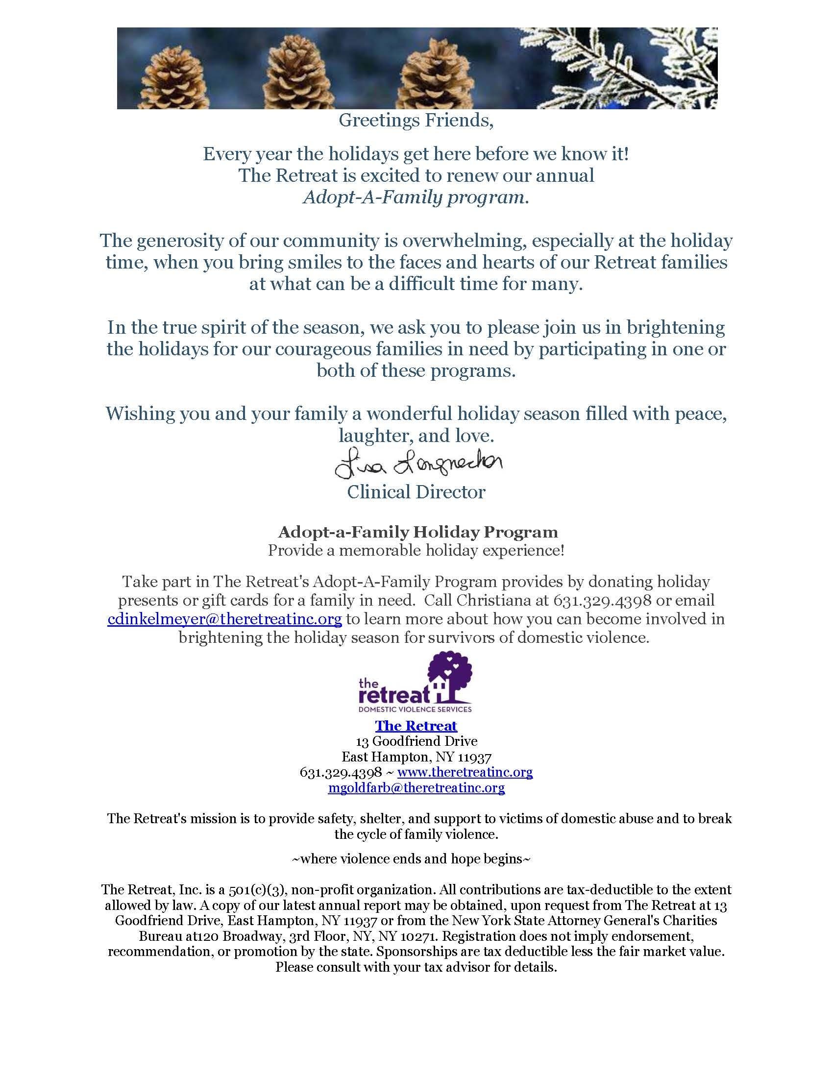 Take part in The Retreat’s Adopt-A-Family Program provides by donating holiday presents or gift cards for a family in need. Call Christiana at 631.329.4398 or email cdinkelmeyer@theretreatinc.org to learn more about how you can become involved in brightening the holiday season for survivors of domestic violence.
