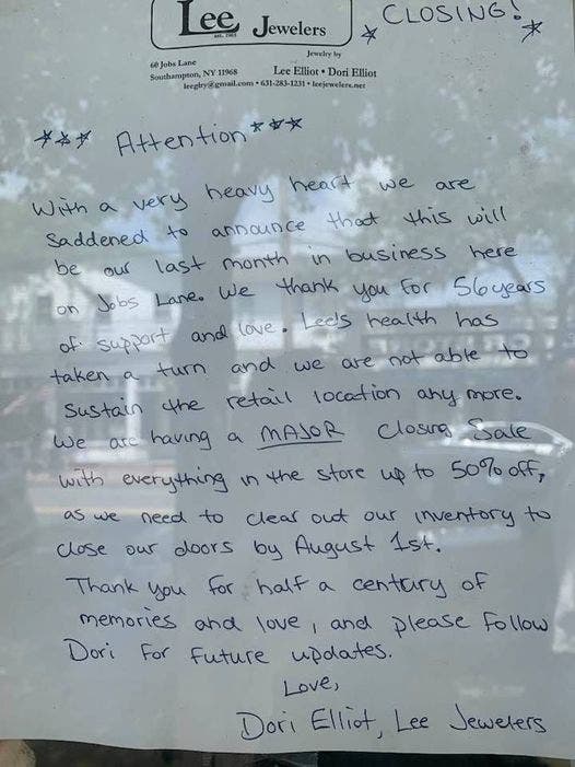 SOUTHAMPTON, NY — The sign was posted in the window of a longtime jewelry shop on Jobs Lane in Southampton in late July, a sad testament to a chapter closing after years of dedicated service to longtime customers as the business' beloved owner faces his last days.