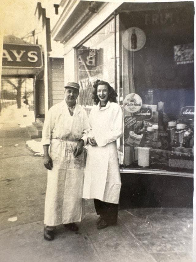 "My father is wearing his bloody butcher’s apron," she said. "In the background is the marquis for the old theatre that was condemned and torn down. Good Ground Market is still in my family and houses my antique store, Good Ground Antiques. My parents were married until my father passed in December 1991."