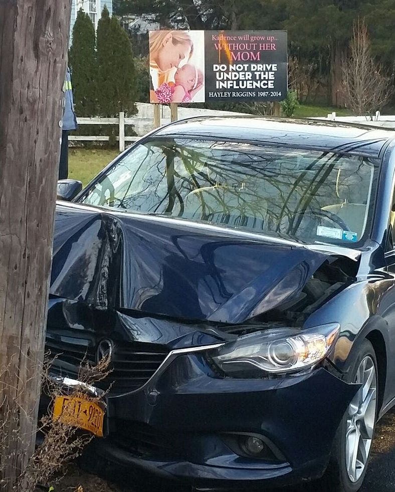 SOUTHAMPTON, NY — Susan Tocci couldn't believe what she was seeing Thursday, when an alleged drunk driver crashed near her home, just feet from a sign she's installed, warning motorists not to drive under the influence.