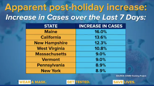 New York is on the "low end" of post-holiday increases in positivity, at 8.9 percent; areas such as California saw an increase of 13.6 percent over the holiday period and Main, 16 percent, he said.