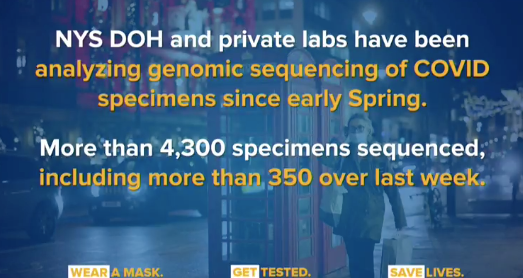 While Cuomo said it is believed that the new strain of coronavirus seen in the U.K. is in the United States, it has not been found in New York. The DOH and private labs have been analyzing genomic sequencing of COVID specimens since early spring; more than 4,300 have been sequenced, including more than 350 last week.