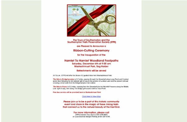 The Town of Southampton and the Southampton Trails Preservation Society will be hosting a ribbon cutting ceremony for the inauguration of the Hamlet to Hamlet Woodland Footpaths.