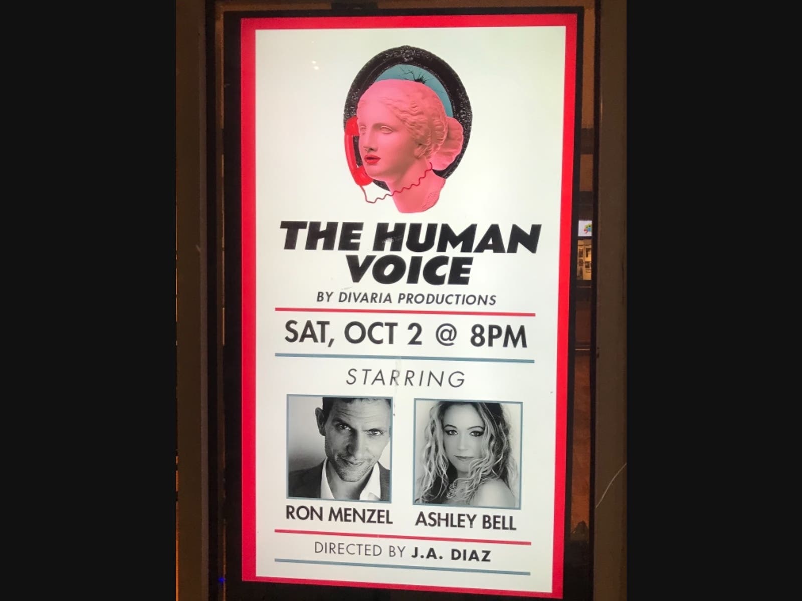 Divaria Productions, along with the Bay Street Theater successfully presented Francis Poulenc and Jean Cocteau’s 1930 one act tragedy, “La Voix Humaine,” on October 2nd at 8pm live on the Bay Street Stage. Renowned Director J.A.Diaz’s vision of combining both opera soprano Ashley Galvani Bell and and the acting talents of James Patrick Nelson turned out to be pure genius.