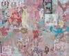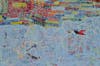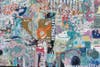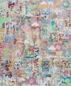 The work Jo Ji and Atanasova paint together is deeply layered with color and abstract shapes and patterns, many of them repeating, like the beats that inspire them. The pair applies a monoprinting technique, using cardboard shapes and all kinds of household items to create the recurring marks on their large canvases. The compositions are made whole with gestural strokes and haphazard drips.