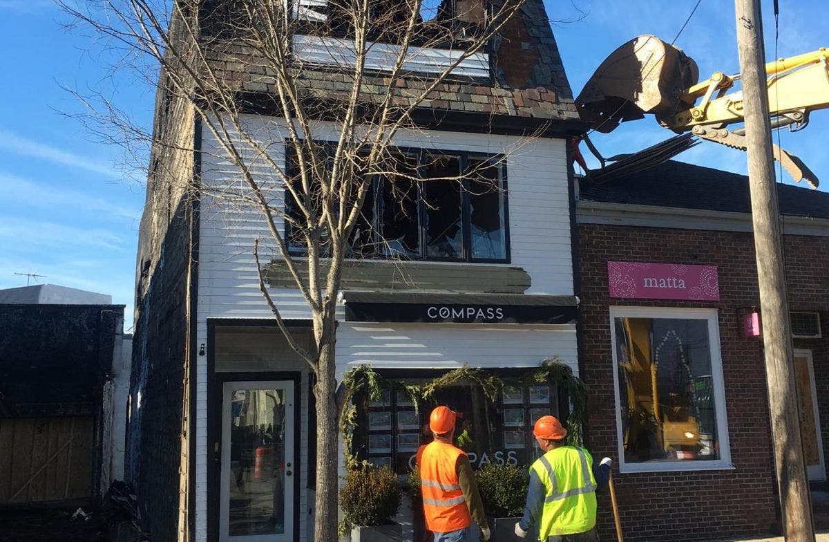 McGuire said officials were on Main Street Monday to demolish the Compass real estate building, badly damaged in the fire.