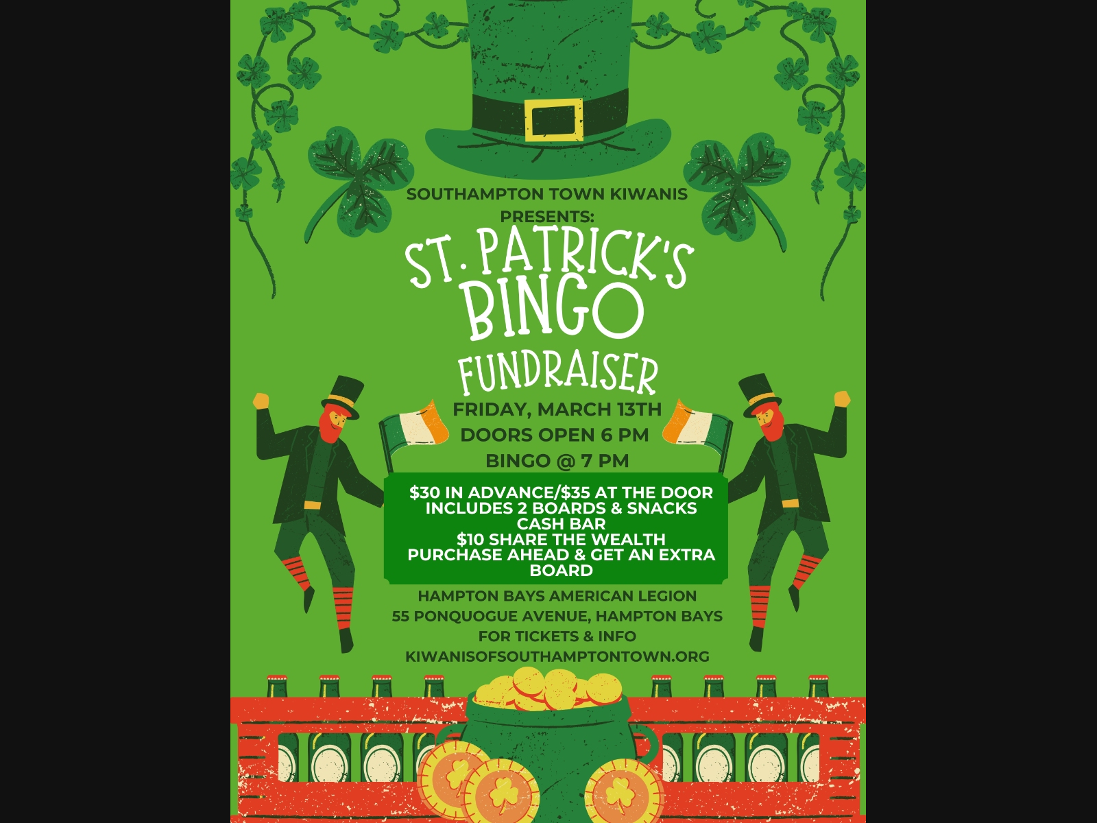 Join us for Bingo on Friday March 13th at the Hampton Bays American Legon. Doors open at 6 and the game starts at 7pm. $30 in advance and $35 at the door. Includes 2 boards & Snacks. Cash Bar $10 share the wealth. Purchase ahead of time and get an extra board.