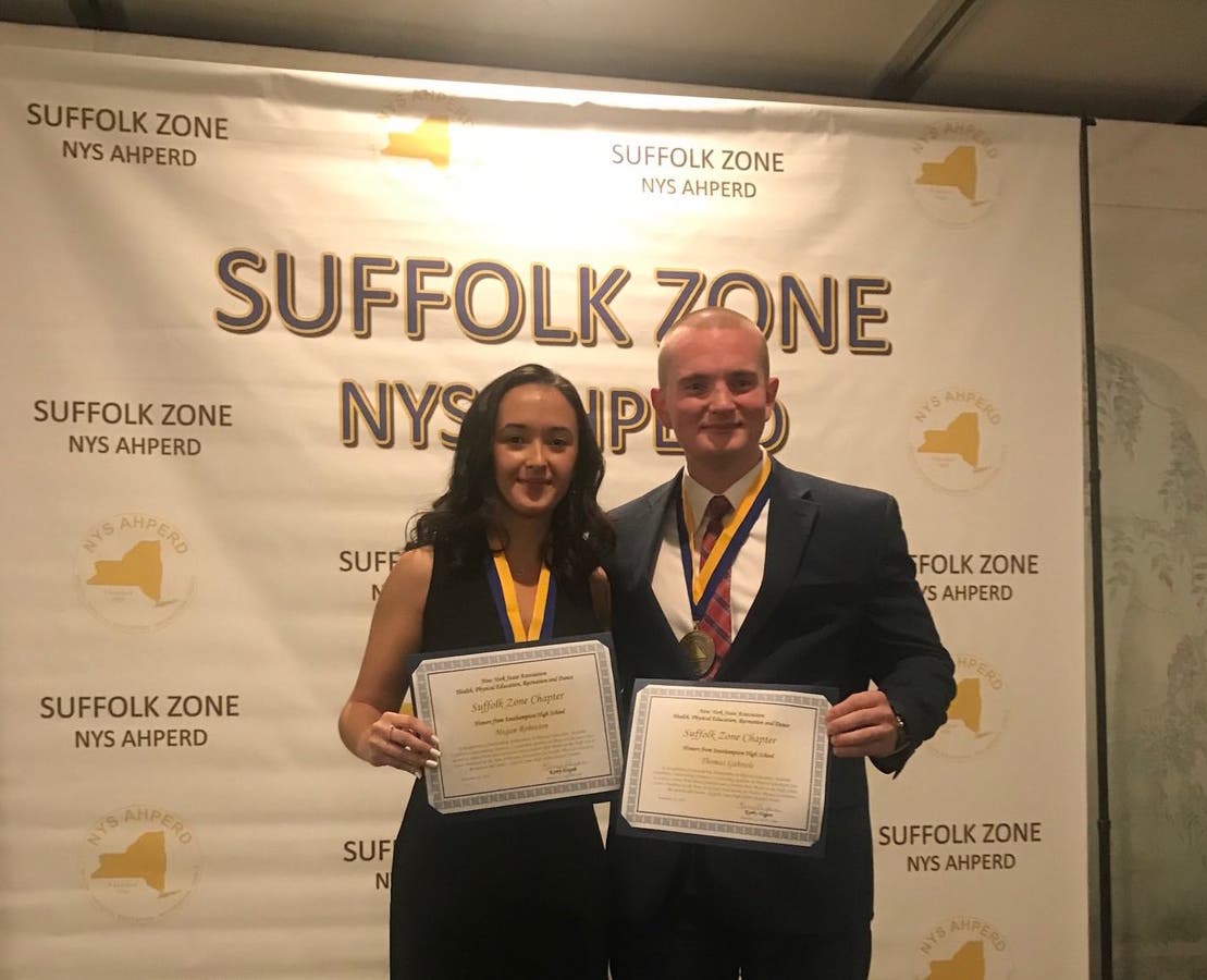 Southampton High School seniors Thomas Gabrielle and Megan Robinson were honored by the New York State Association for Health, Physical Education, Recreation and Dance on Nov. 28 as winners of the Suffolk Zone Student Leadership Award.
