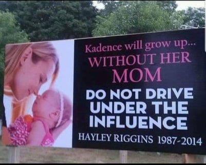 One sign, on Tocci's property, says "Save A Life: Do Not Text And Drive," with the years of Barbara Tocci's life, 1966 to 2014. The other, on Flanders Road, shows Hayley holding her infant daughter and says: "Kadence Will Grow Up Without Her Mom: Do Not Drive Under The Influence. Hayley Riggins, 1987 to 2014."