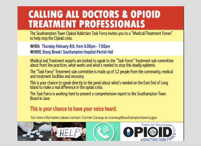 SOUTHAMPTON, NY — Southampton Town's opioid addiction task force will bring together physicians and opioid treatment professionals Thursday night to participate in a "medical treatment forum" and help stem the devastating tide of addiction.