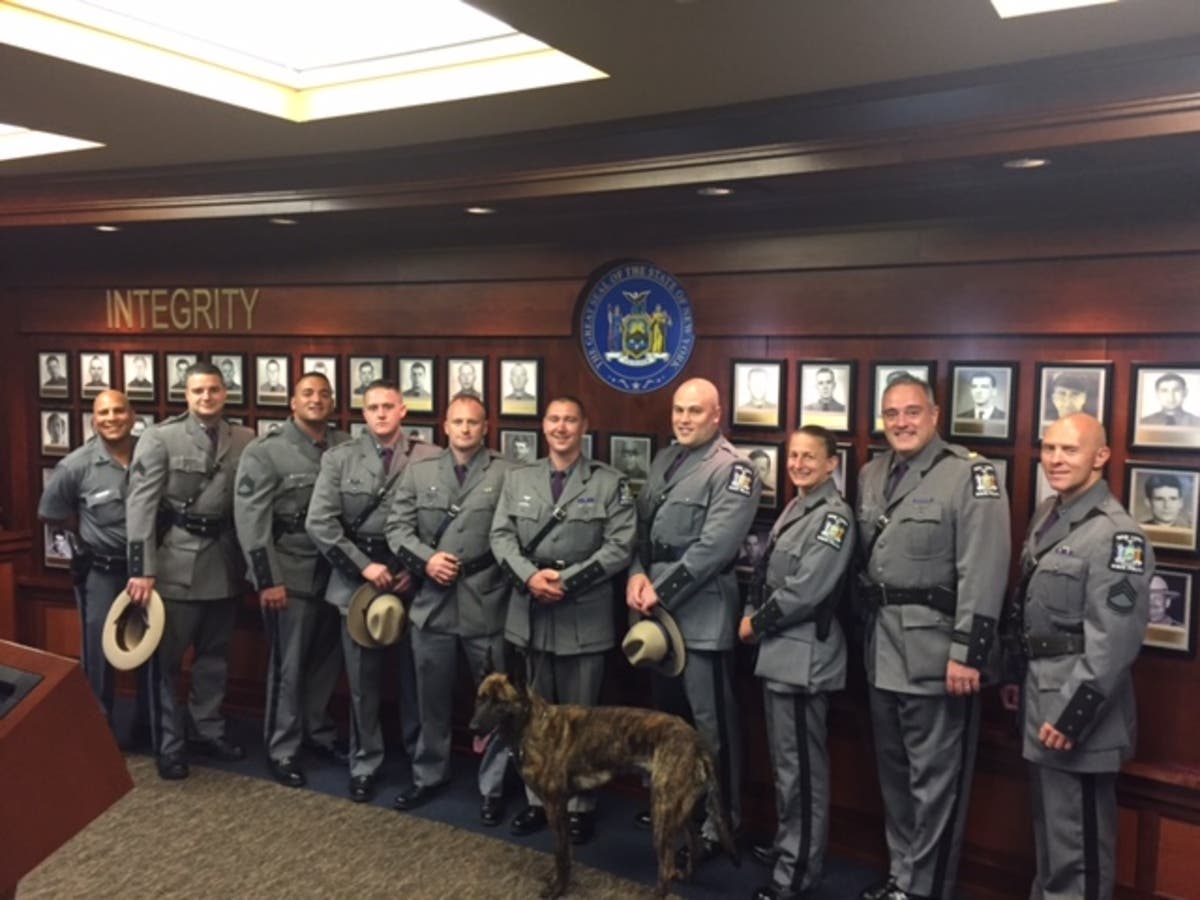 The New York State Police from Troop K congratulate Trooper Lewis E. Godfroy, IV and his new canine partner, Graydon. Trooper Godfroy and Graydon graduated from the State Police Canine Handler Basic School on Aug. 11.