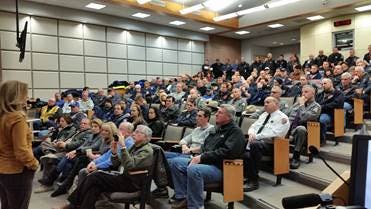 Photo Caption: County Executive MaryEllen Odell speaks to first responders and other members of the community about what the process will be to find a new commissioner of the Bureau of Emergency Services at the TOPS building on Saturday, Jan. 10./contributed