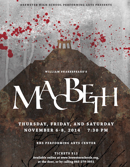 Macbeth runs Thursday November 6th, Friday November 7th, and Saturday November 8th at 7:30 PM at the Brewster High School Performing Arts Center, 50 Foggintown Rd, Brewster, NY. Advanced tickets are now on sale for $12 and can be purchased online at www.brewsterschools.org, at the door, or by calling 845.279.5051. Due to the violent nature of the proceedings, parental guidance is suggested for this production.