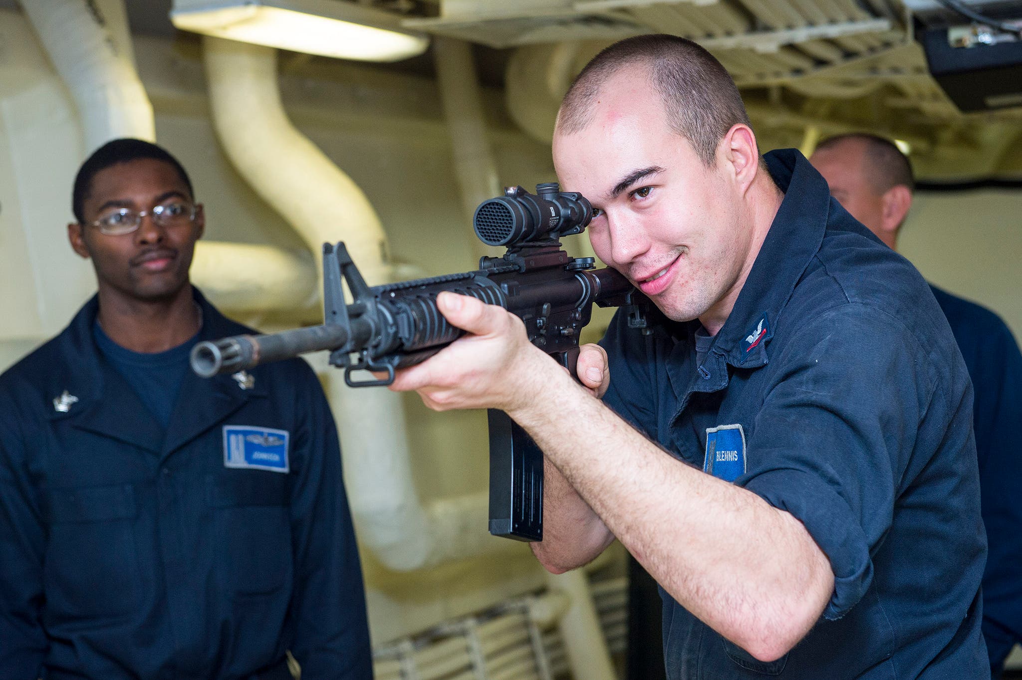 ATLANTIC OCEAN (Dec. 18, 2014) - Gunner’s Mate 2nd Class Justin Blennis, a Carmel, N.Y., native stationed aboard San Antonio-class amphibious transport dock ship USS New York (LPD 21), participates in simulated weapon training while underway. USS New York is deployed as part of the Iwo Jima Amphibious Ready Group/24th Marine Expeditionary Unit (IWO ARG/24MEU) in support of maritime security operations (MSO) and theater security cooperation efforts in the U.S. 5th and 6th Fleet areas of responsibility. The Iwo Jima ARG/24 MEU is comprised of embarked Marines from the 24th MEU, the multi-purpose amphibious assault ship USS Iwo Jima (LHD 7), the amphibious dock landing ship USS Fort McHenry (LSD 43), and the amphibious transport dock ship USS New York (LPD 21).