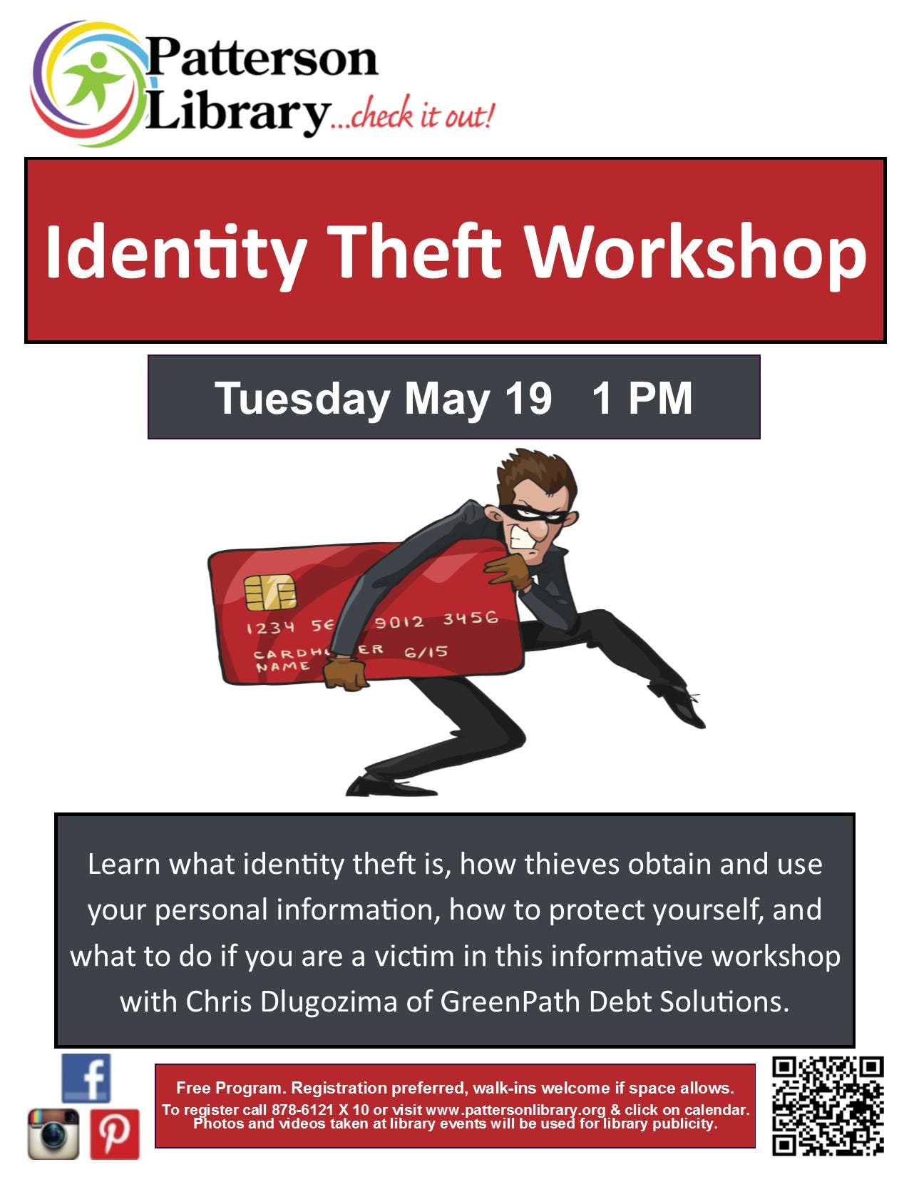 Learn what identity theft is, how thieves obtain and use your personal information, how to protect yourself, and what to do if you are a victim in this informative workshop with Chris Dlugozima of GreenPath Debt Solutions. Registration preferred, walk-ins welcome if space allows. To register or for more information, visit us online at www.pattersonlibrary.org and click on calendar or call 845-878-6121 x10. Free program. e