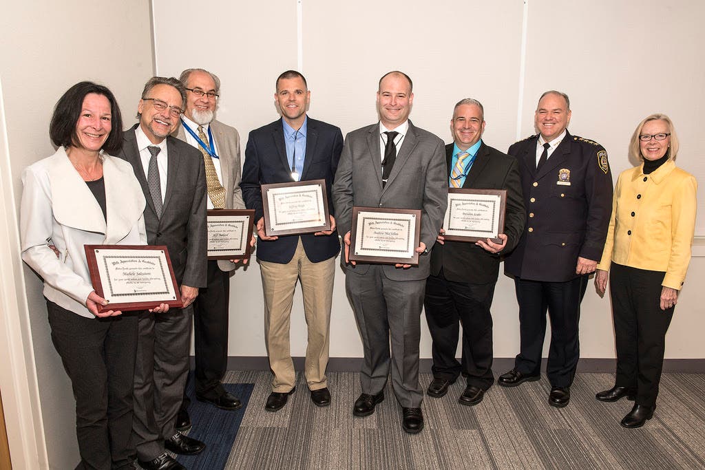 PHOTO: (Left to Right) Michele Salvatore, Metro-North President Joseph Giulietti, Jeff Ballard, Jeffrey Boyle, Andrew McClellan, Brendan Szabo, MTA Police Chief Owen Monaghan, MTA Board's Metro-North Railroad Committee Chair Susan Metzger/ MTA