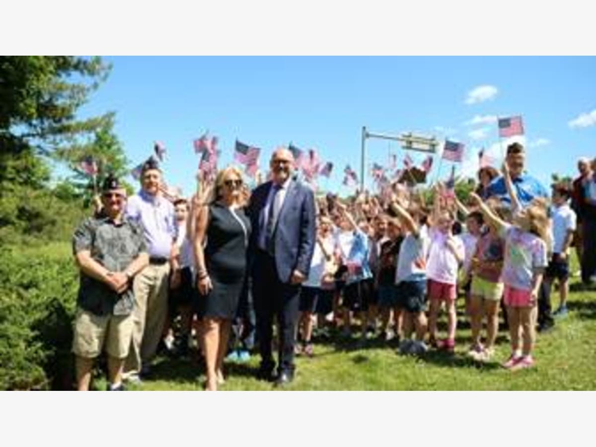 CARMEL, NY - Putnam County Executive MaryEllen Odell, Sheriff Robert Langely Jr. and Director of Veterans Services Karl Rohde honored Flag Day on Tuesday, June 14 by hosting a small ceremony at the Row of Honor in Carmel with students from St. James School.