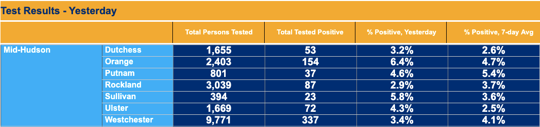 The Mid-Hudson region has the second highest test positivity rate in the state โ 3.8 percent, Gov. Andrew Cuomo said during a news briefing Friday. Putnam County has the highest rolling average in the region as of Friday, at 5.4 percent.