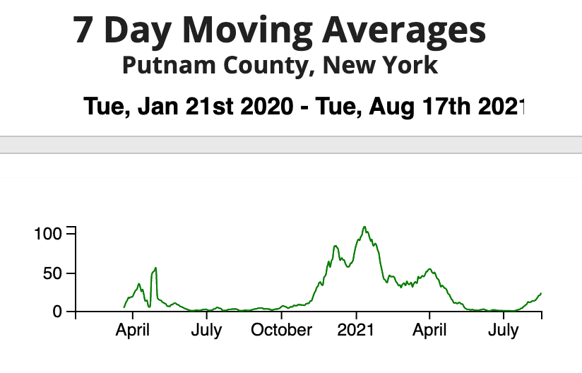 In the seven days ended Aug. 17, according to the CDC, cases of coronavirus went up by 61.46 percent in Putnam, with 157.65 per 100,000 population.