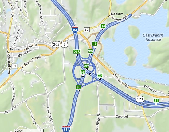 Motorists on northbound Interstate 684 wanting to travel east on Interstate 84 are advised to follow the marked detour, which will direct them to Exit 10 (Route 6/202), then to Route 6/202 West to Interstate 684 South to Exit 9E (Interstate 84 East).