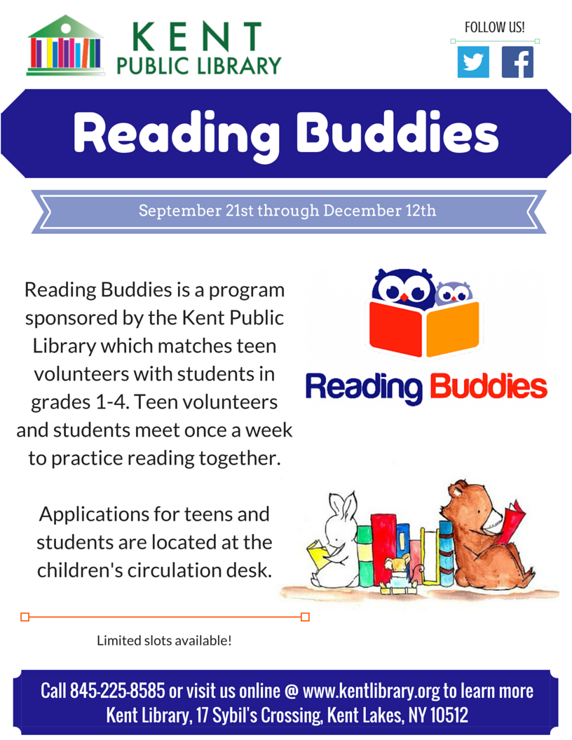 Reading Buddies is a program which pairs teen volunteers with students grades 1-4. Teen volunteers and students meet once a week to practice reading skills.