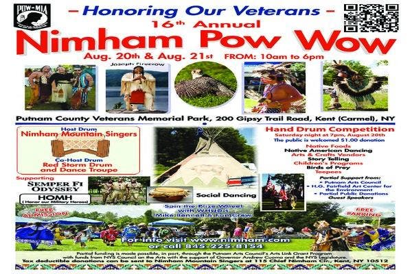 The 16th Annual Daniel Nimham Intertribal Pow Wow is Aug. 20-21 this year at the Putnam County Veterans Memorial Park on Gipsy Trail Road, off Route 301 in Carmel, NY.