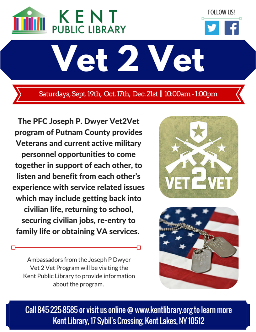 The PFC Joseph P. Dwyer Vet2Vet program of Putnam County provides Veterans and current active military personnel opportunities to come together in support of each other, to listen and benefit from each others experience with service related issues which may include getting back into civilian life, returning to school, securing civilian jobs, re-entry to family life or obtaining VA services. In addition to community activities and programming, peer support is also available to military families as well. This program has no restriction on discharge status, or service dates. The program is named in honor of Private First Class Joseph Patrick Dwyer, an Army Medic who served in Iraq, and subsequently passed away after a long battle with Post-Traumatic Stress Disorder (PTSD).