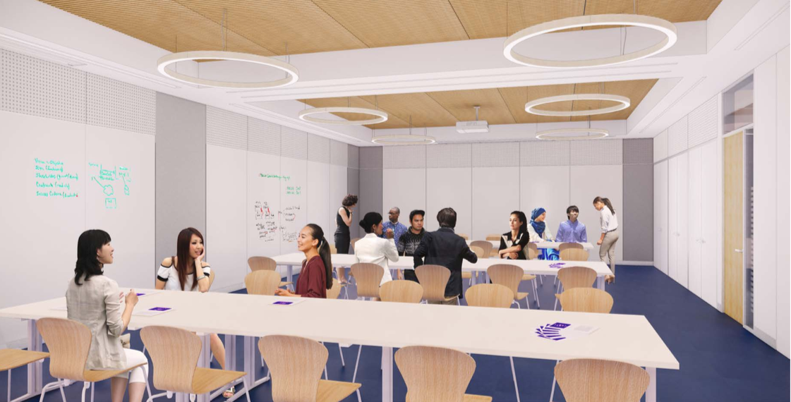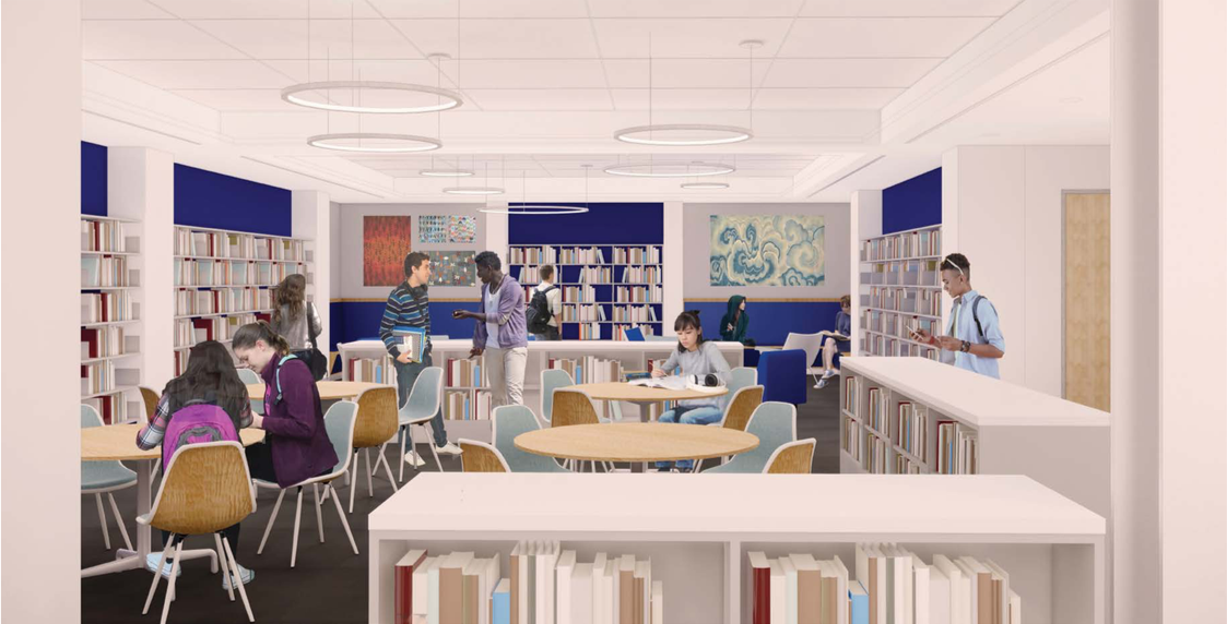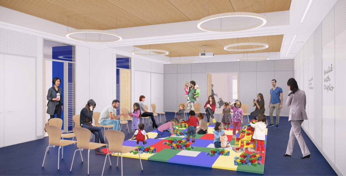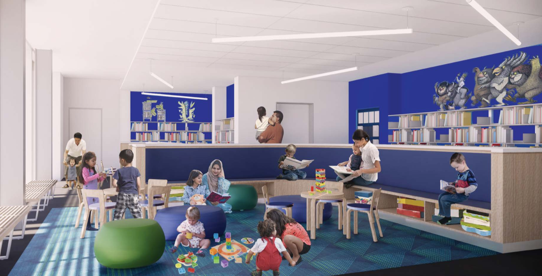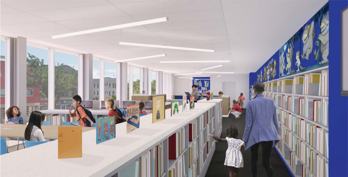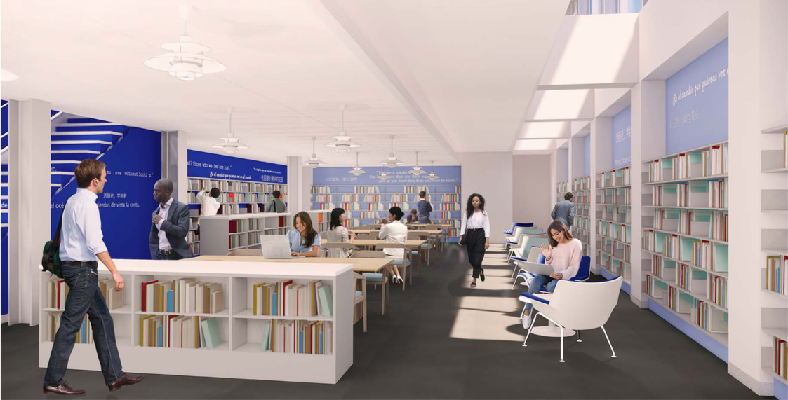 The space also has room for some specific programming, including an English conversation area and a kid's program area, renderings show.