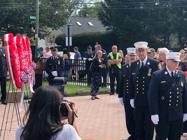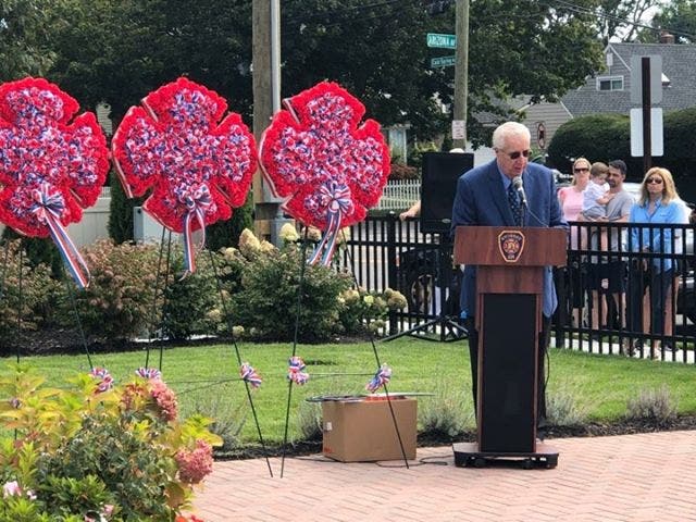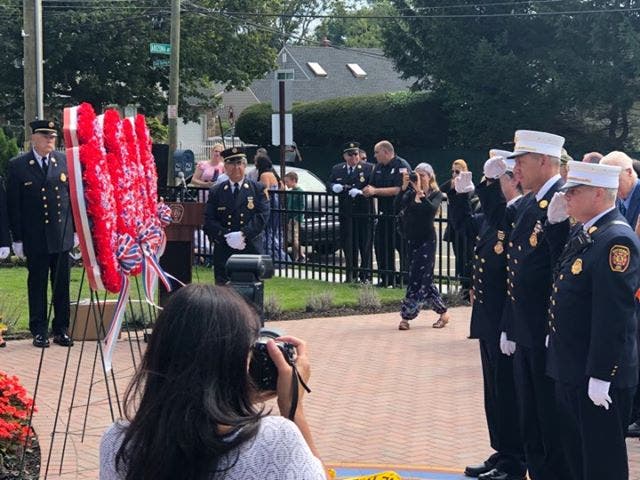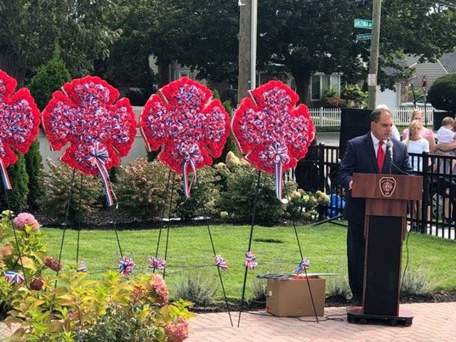 Graceffa led the ceremony, which included a benediction and blessing from department deacon Ted Kolakowski. Joseph Saladino, supervisor of the Town of Oyster Bay, and former state Sen. Carl Marcellino spoke, paying tribute to the four department members whose names appear on the "Line of Duty Deaths" monument. Family members placed a Maltese cross floral arrangement in front of the monument to honor each victim.