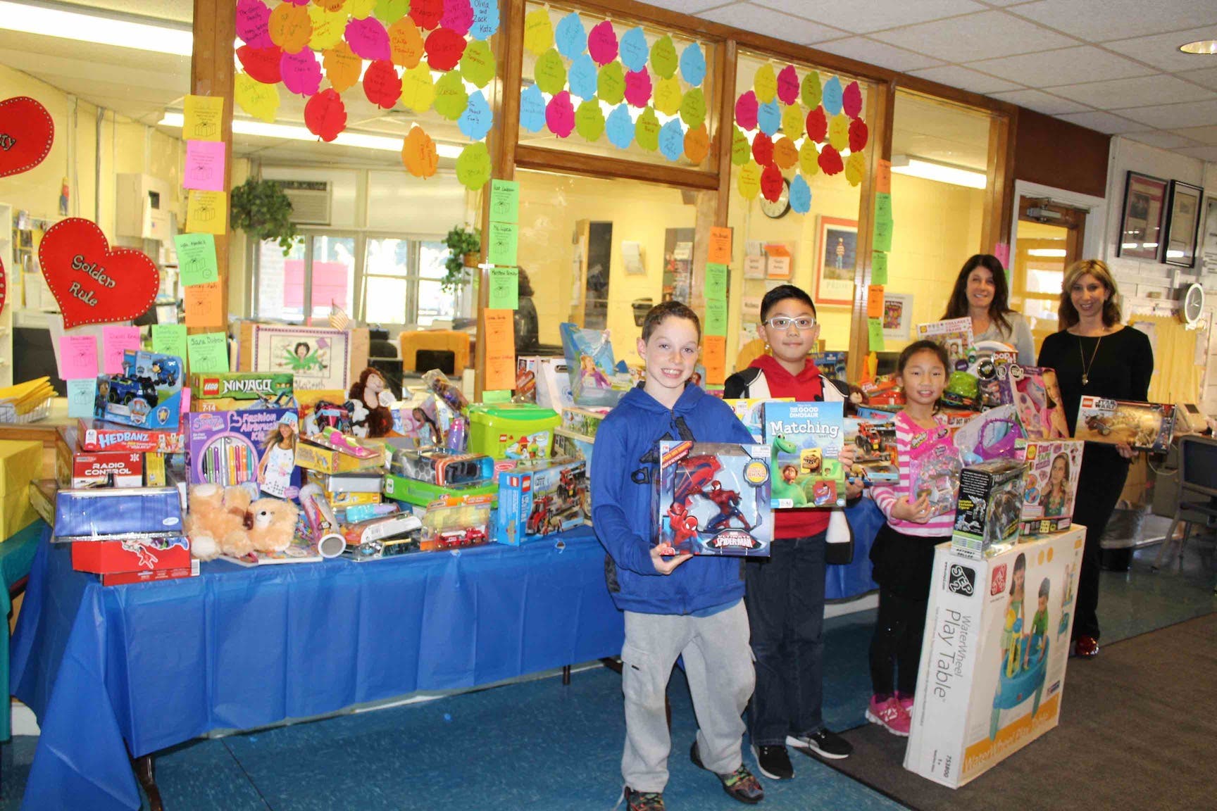 Story by Syntax, Photo courtesy of the Syosset CSD: Pictured from left are A.P. Willits Student Council President Zach Kam, Vice President Griffin Hon, Secretary Maggie Chen, and advisers Lorraine Avazis and Elissa Wagner alongside the toys they collected from the school for the John Theissen Foundation.