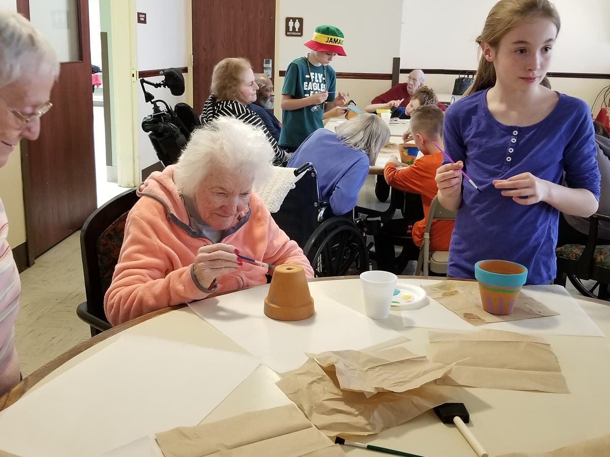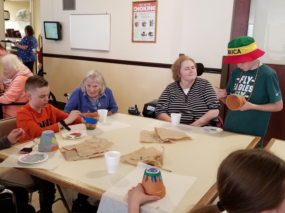 Residents and staff at Onondaga Center for Rehabilitation and Nursing on East Avenue in Minoa spent much of the day on Monday, April 30th with 5th grade students from Minoa Elementary School painting flower pots for spring. Since last December, Onondaga Center has partnered up with the school and the group of 5th graders, also known as the Jr. Crew, to come to the Center to spend time with the kids and take part in a number of activities, this time it was painting pots.
