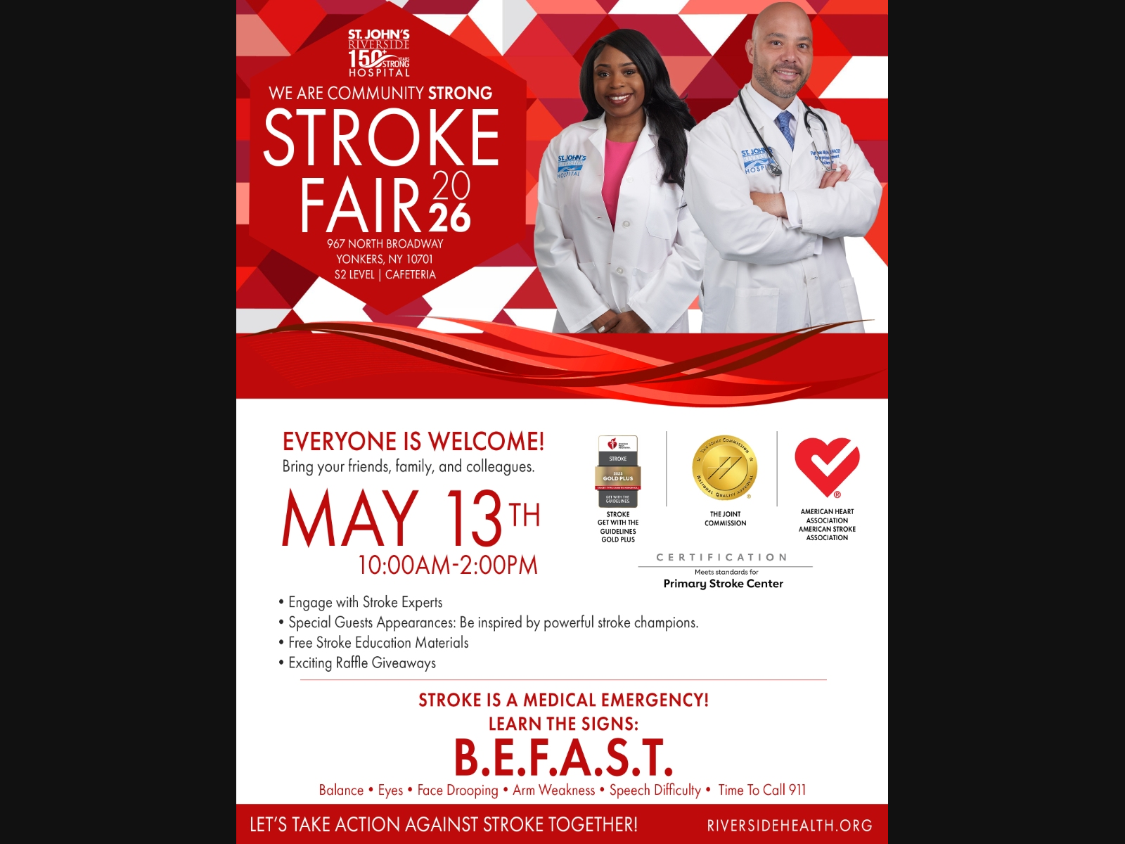 Join us on May 13th from 10:00am-2:00pm for the St. John's Riverside Hospital Stroke Fair. Everyone is welcome!