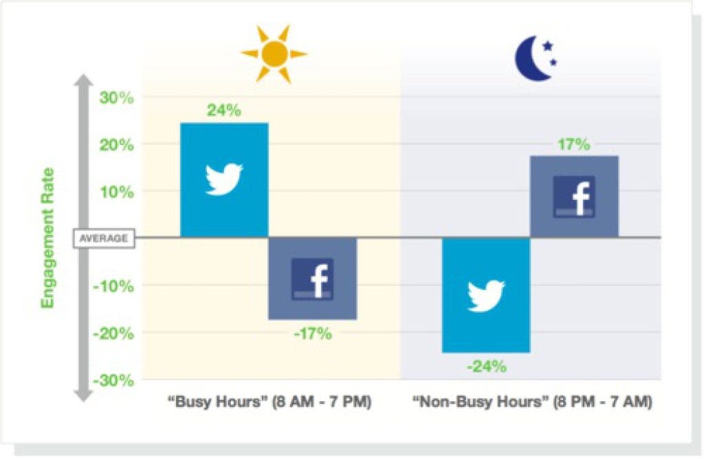 Twitter posts, on the other hand, actually fared better in that regard, garnering generally higher engagement rates during the on-peak hours.