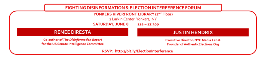 IN LIGHT OF MUELLER REPORT AND LACK OF GOVT ACTION, FORUM IN YONKERS SEEKS TO EDUCATE AND ARM CITIZENS AGAINST SOCIAL MEDIA DISINFORMATION