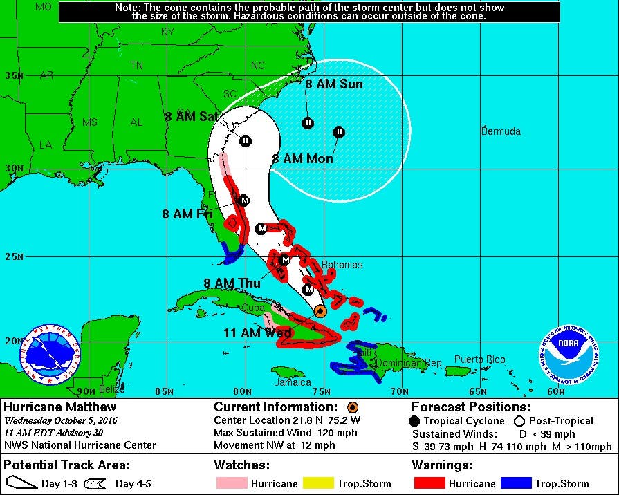 Matthew is expected to make a northwest turn on Wednesday as it moves across the Bahamas through Thursday. "Hurricane conditions are expected to first reach the hurricane warning area in Florida by late Thursday and will spread northward Thursday night and Friday," forecasters wrote in the 11 a.m. update.