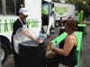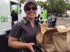 Others on foot approached the green-and-white trucks parked in the municipal lot for their complimentary bottle of water and hot sandwich. The company was initially going to give away 1,000 sandwiches to the citizens, but upped the amount to 2,500 from 9 a.m. until it was more of a brunch than a breakfast hour.