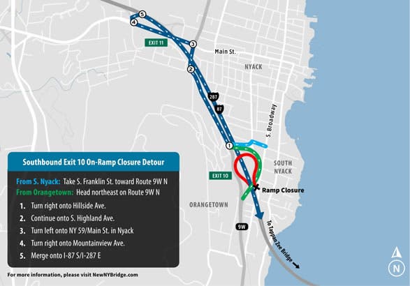 The closure will allow Tappan Zee Constructors, LLC (TZC) to continue restriping the roadway and moving temporary barriers. Drivers will be directed to use the entrance ramp located on Route 59 in Nyack.